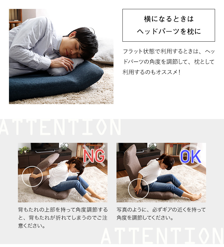 背もたれ、ヘッド、フットの3カ所に14段階リクライニング機能を搭載した座椅子です。フット部が上に起き上がるアップスタイルです。信頼性の高い日本メーカーKOYO製ギアを採用。自分好みの角度でゆったりくつろげます。全面カバーリング仕様。カバーを取り外して洗濯できます。しっかりとしたクッション性、適度な硬さの座面です。使わない時は、コンパクトに折りたたんで収納できます。確かな品質の日本製。レッド、オレンジ、ネイビー、グリーン、ブラウン、ターコイズブルーの6色から選べます。
