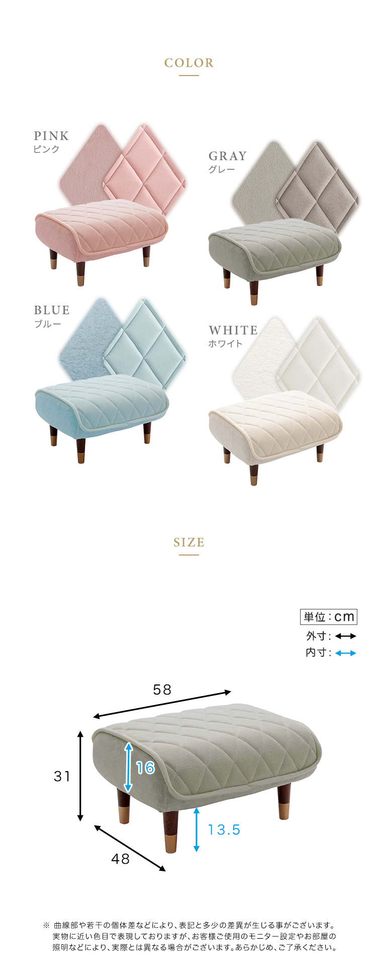 ダイヤモンドキルトの美しさ、大人も使えるかわいいデザイン、ダイヤモンドキルトオットマン単品です。スツールやサイドテーブル代わりにも使えるオットマンです。ゴールドカラーがあしらわれた華やかな脚。ロータイプ脚も付属しています。座面にはポケットコイルを使用しており、高品質な座り心地が楽しめます。肌触りの良いベロア生地を使用。本体カラーは、ピンク、グレー、ブルー、ホワイトの4色から選べます。脚カラーは、ブラウン、ブラックの2色から選べます。脚のみお客様取り付けの完成品。