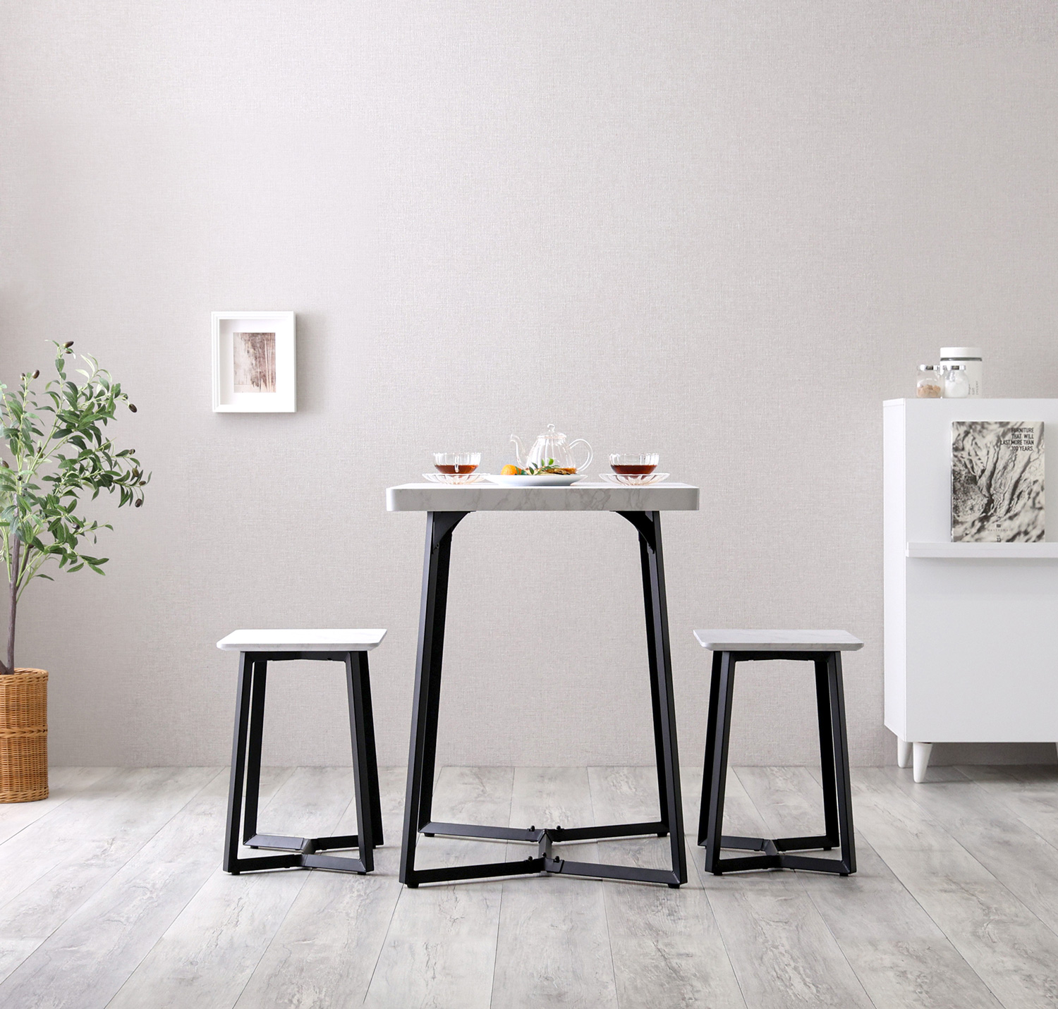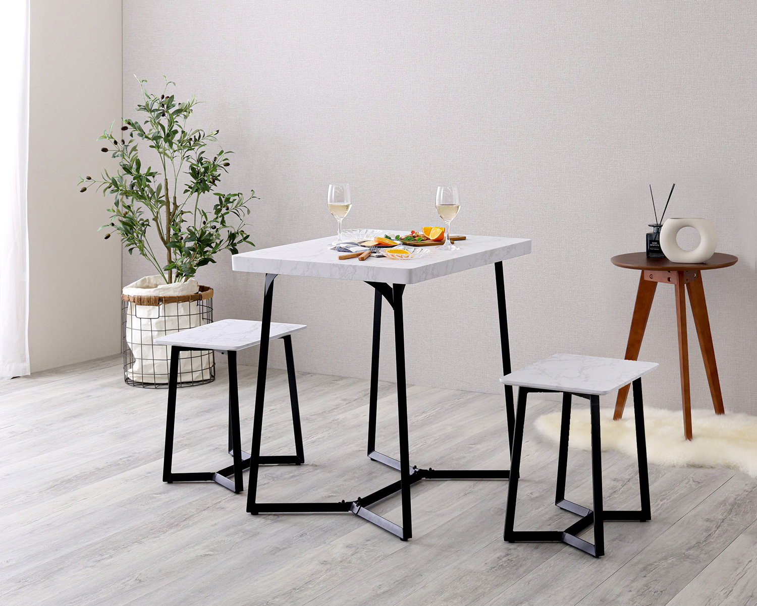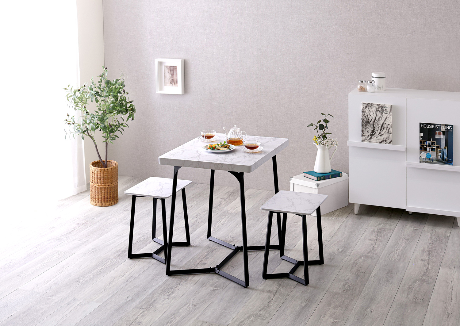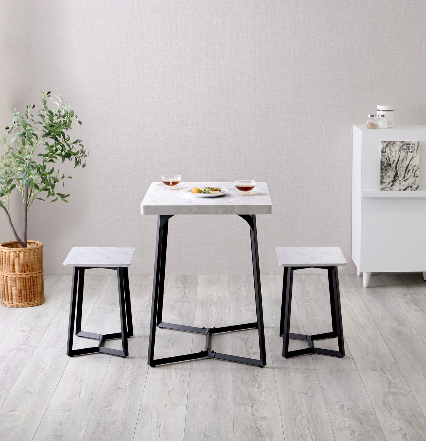 美しい大理石の模様を施したダイニングテーブルと、スツールタイプのチェア2脚の大理石調ダイニング3点セットです。直線的なデザイン、シャープなフォルムで洗練された印象のダイニング。リアルな大理石柄の天板のダイニングテーブルは、1人~2人で使うのに丁度良いコンパクトサイズ。チェアはスツールタイプを採用しており、前後左右から腰掛けやすく、軽量でテーブルの下にすっきり収まる設計。耐荷重約100kgで安定感があります。ホワイト、グレーの2色から選べます。