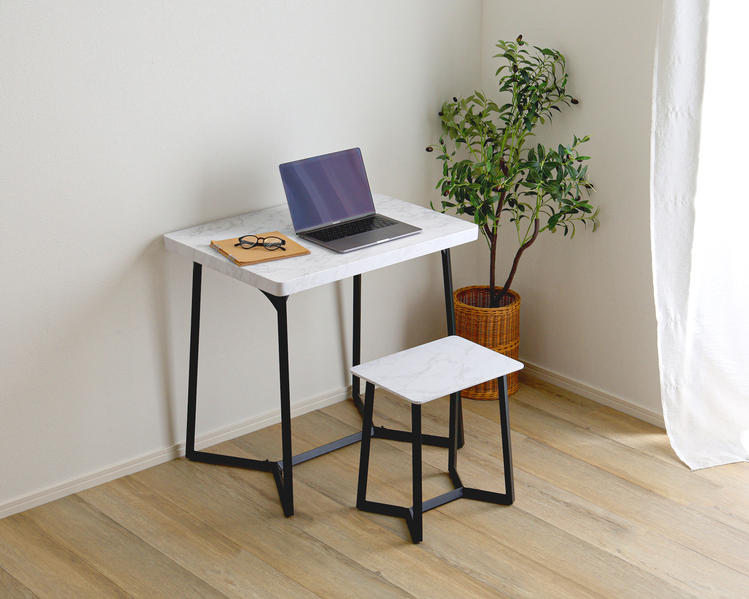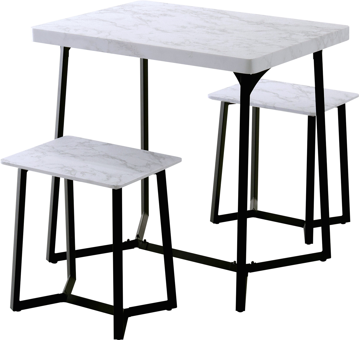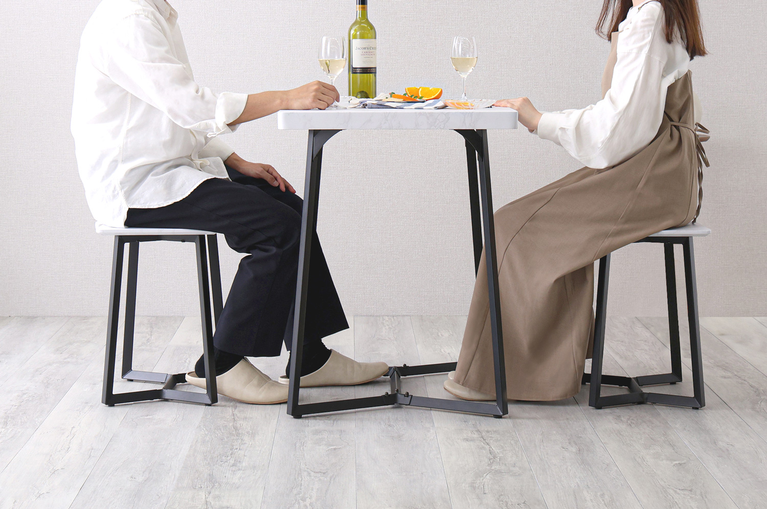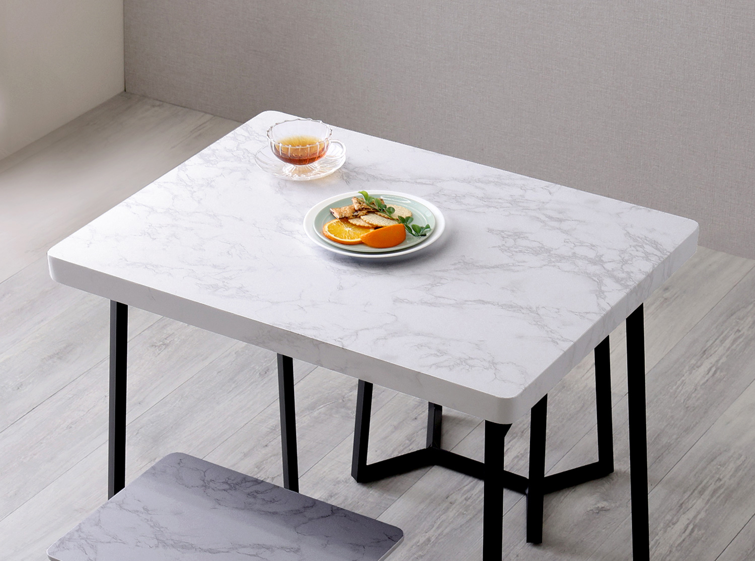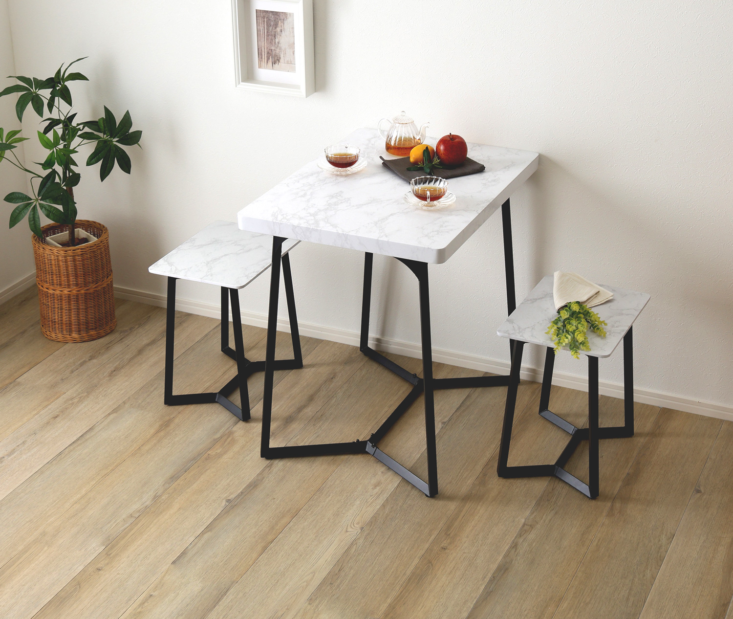 美しい大理石の模様を施したダイニングテーブルと、スツールタイプのチェア2脚の大理石調ダイニング3点セットです。直線的なデザイン、シャープなフォルムで洗練された印象のダイニング。リアルな大理石柄の天板のダイニングテーブルは、1人~2人で使うのに丁度良いコンパクトサイズ。チェアはスツールタイプを採用しており、前後左右から腰掛けやすく、軽量でテーブルの下にすっきり収まる設計。耐荷重約100kgで安定感があります。ホワイト、グレーの2色から選べます。