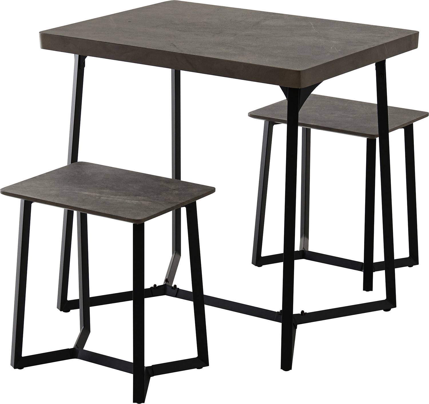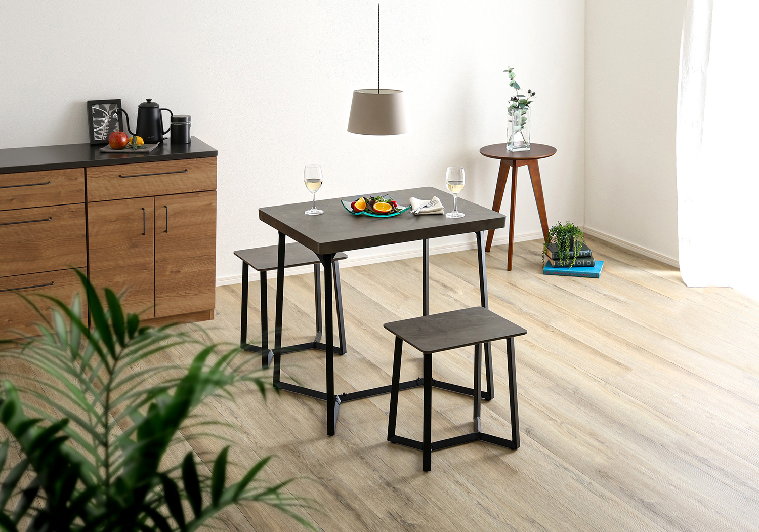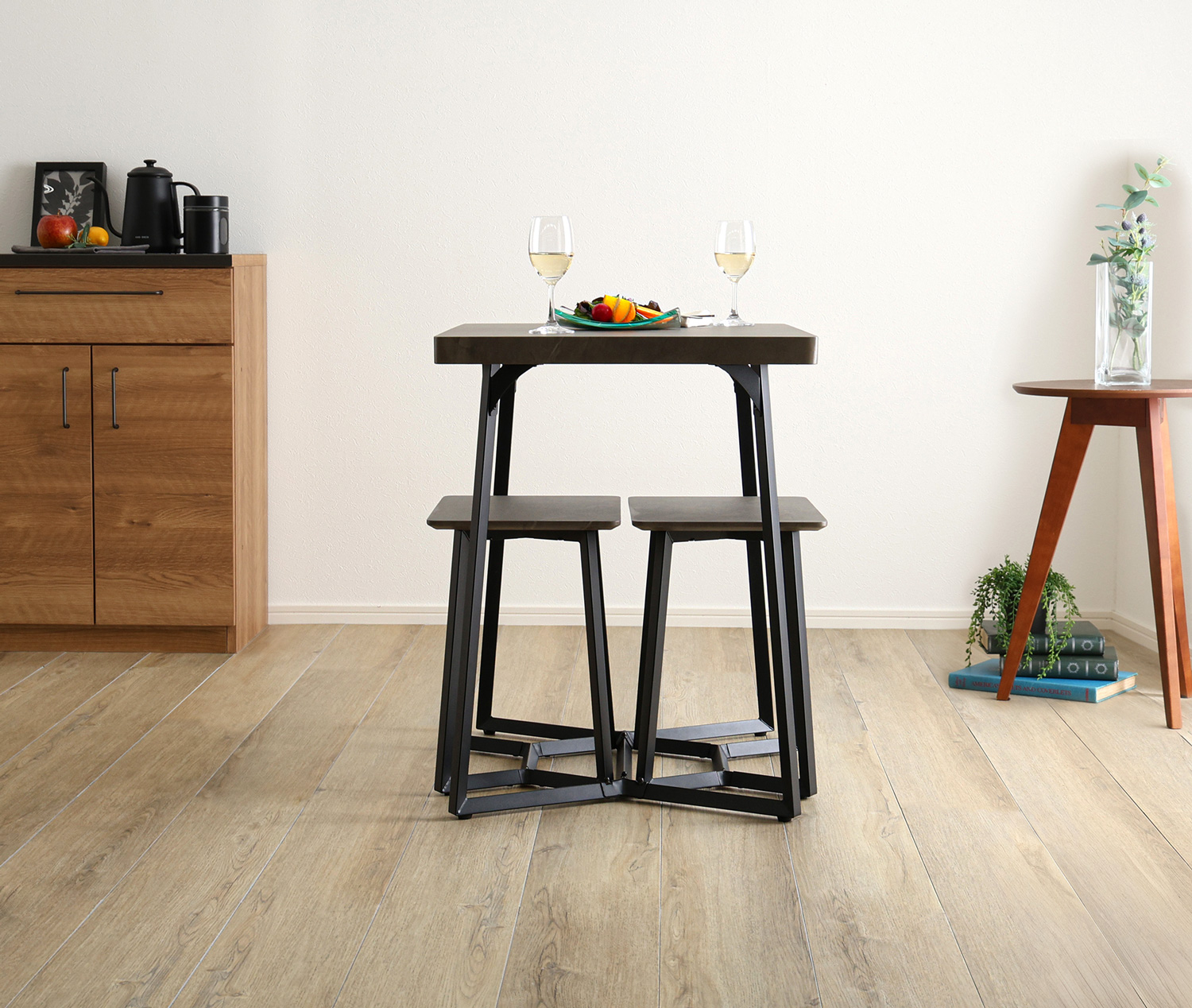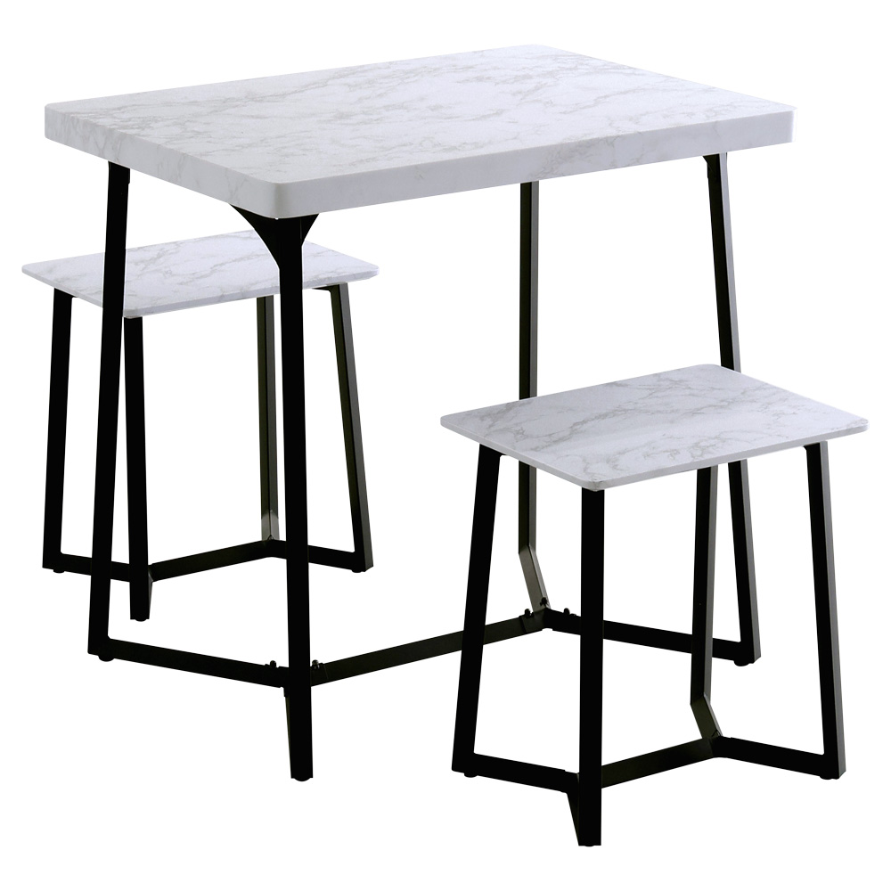 美しい大理石の模様を施したダイニングテーブルと、スツールタイプのチェア2脚の大理石調ダイニング3点セットです。直線的なデザイン、シャープなフォルムで洗練された印象のダイニング。リアルな大理石柄の天板のダイニングテーブルは、1人~2人で使うのに丁度良いコンパクトサイズ。チェアはスツールタイプを採用しており、前後左右から腰掛けやすく、軽量でテーブルの下にすっきり収まる設計。耐荷重約100kgで安定感があります。ホワイト、グレーの2色から選べます。