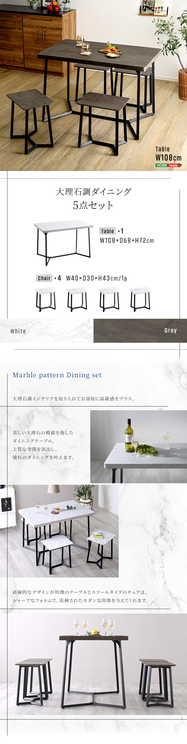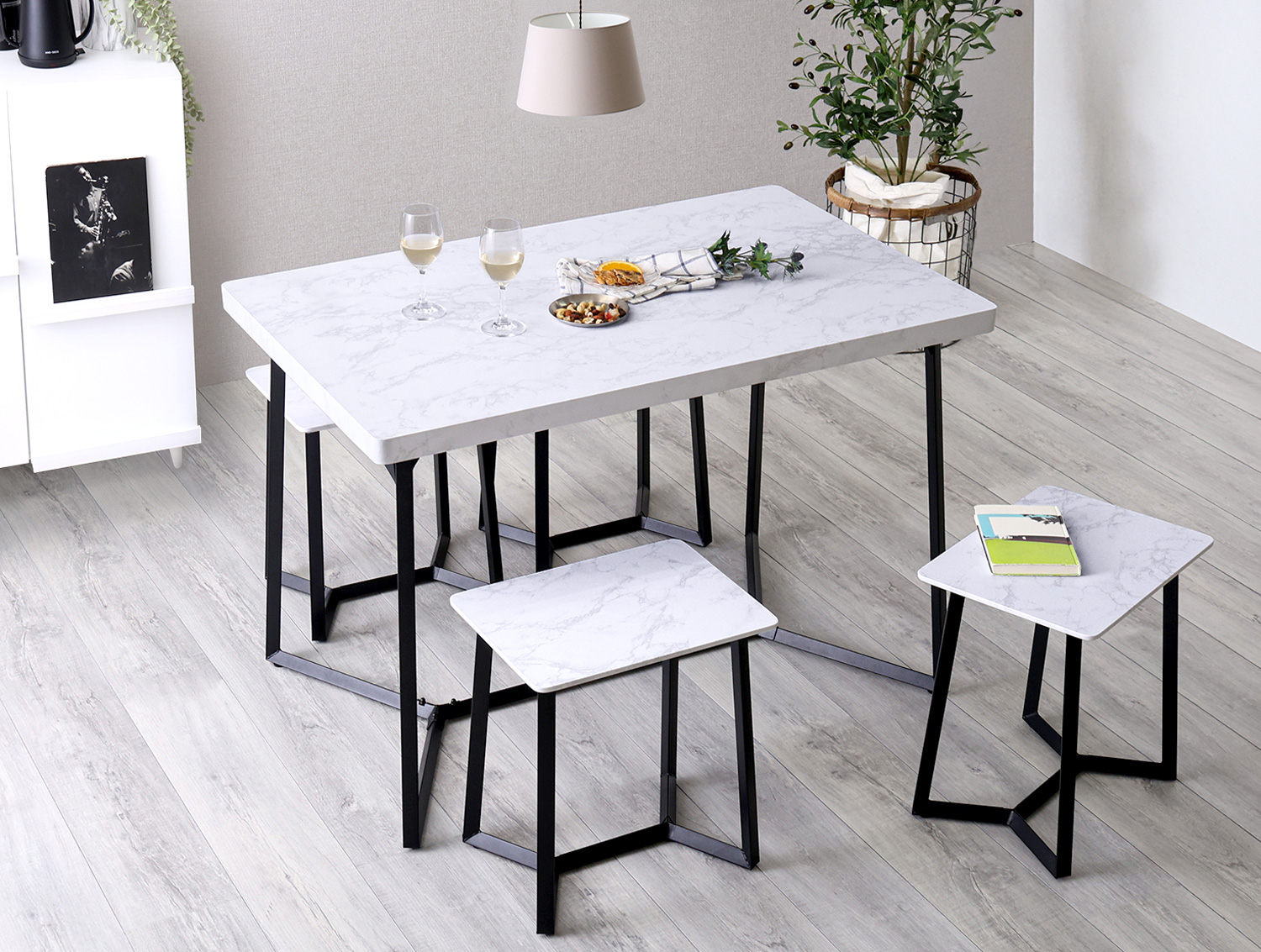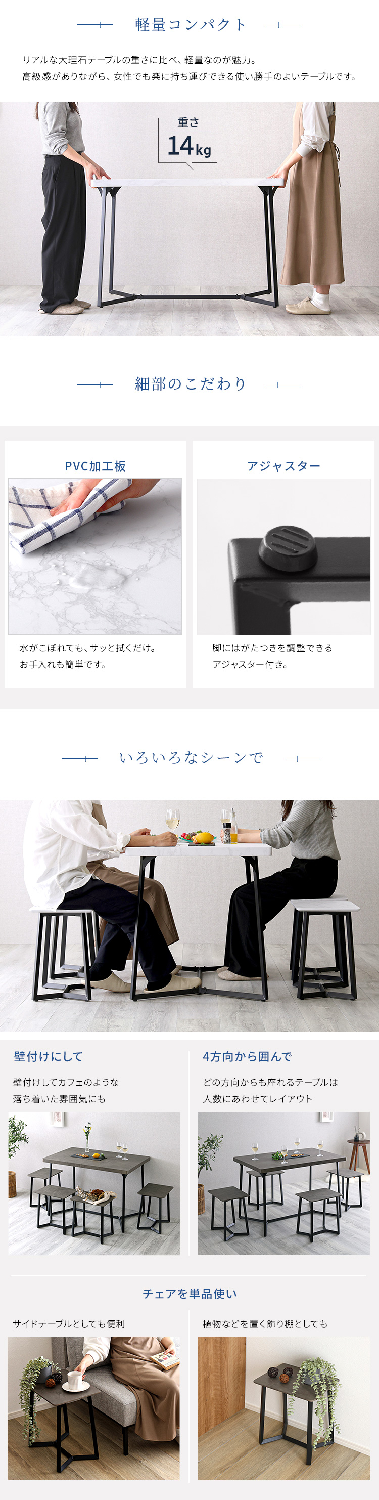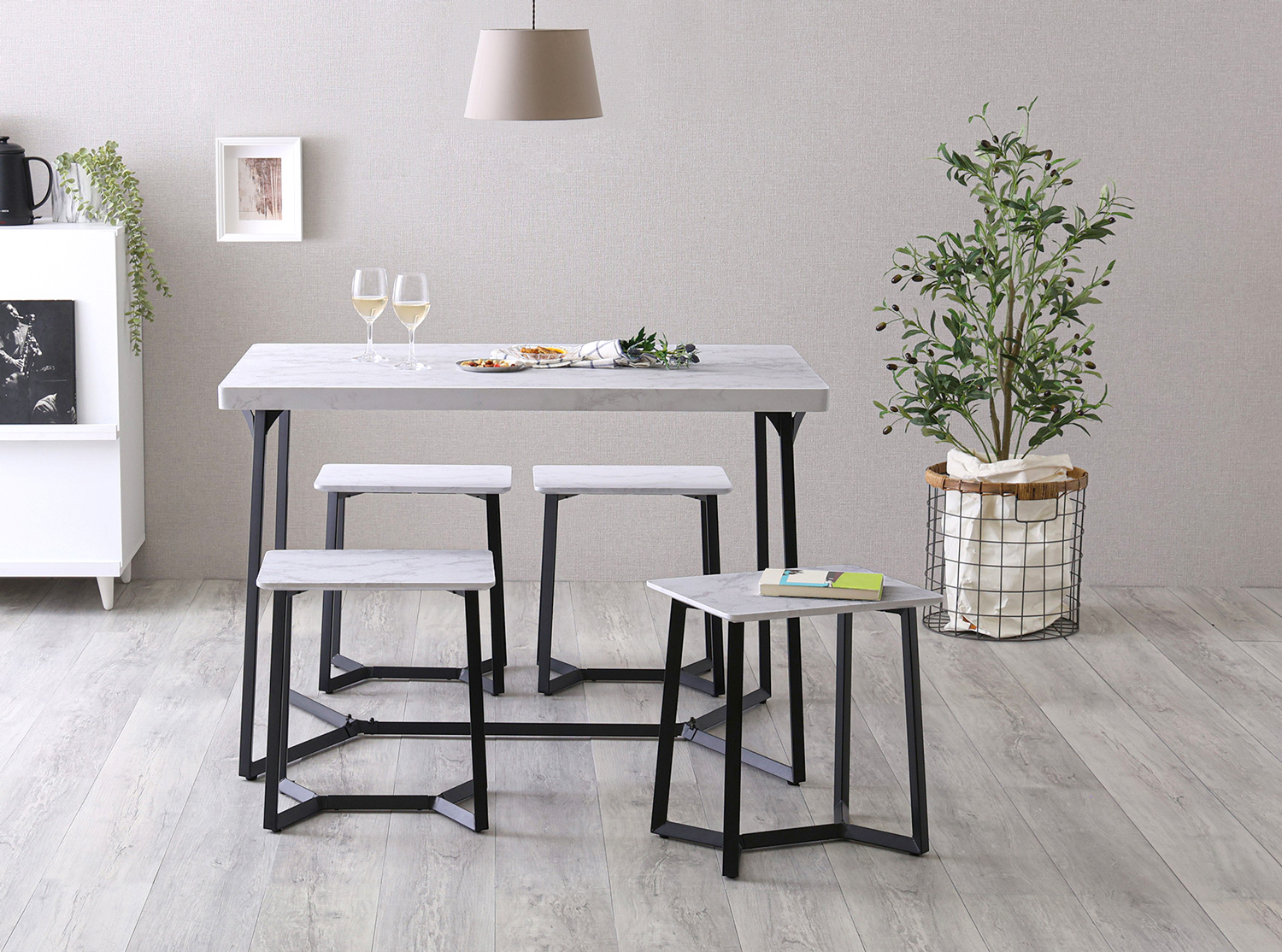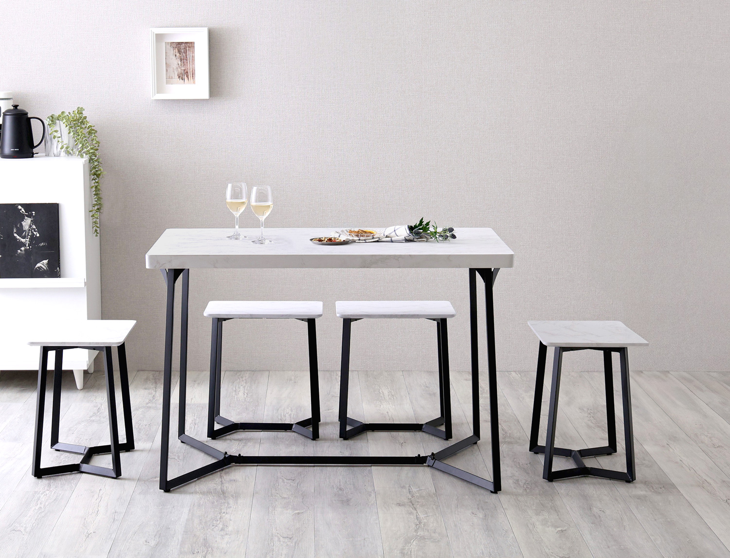 美しい大理石の模様を施したダイニングテーブルと、スツールタイプのチェア4脚の大理石調ダイニング5点セットです。直線的なデザイン、シャープなフォルムで洗練された印象のダイニング。リアルな大理石柄の天板のダイニングテーブルは、2人~4人で使うのに丁度良い、広すぎず、狭すぎない食事にぴったりのサイズ。チェアはスツールタイプを採用しており、前後左右から腰掛けやすく、軽量で出し入れもスムーズ。耐荷重約100kgで安定感があります。ホワイト、グレーの2色から選べます。