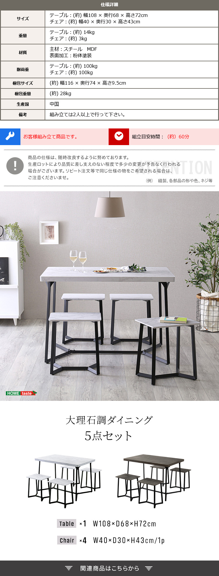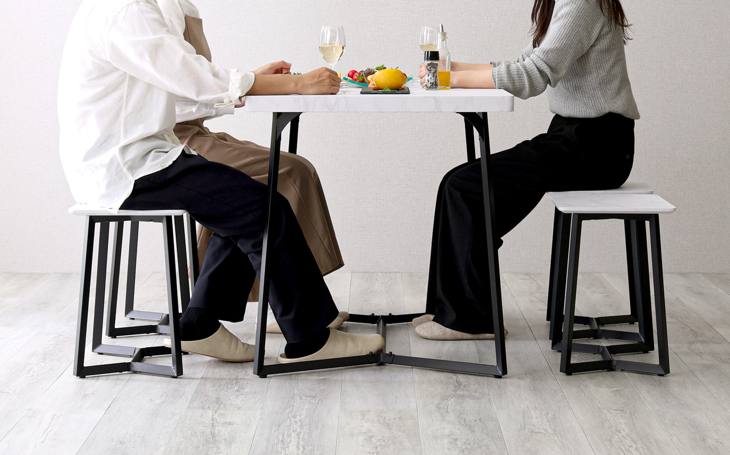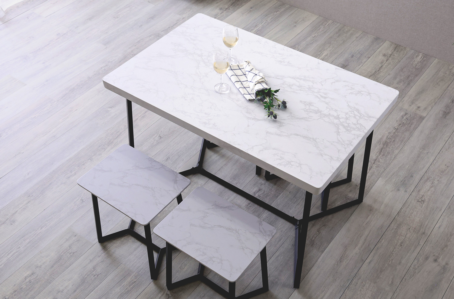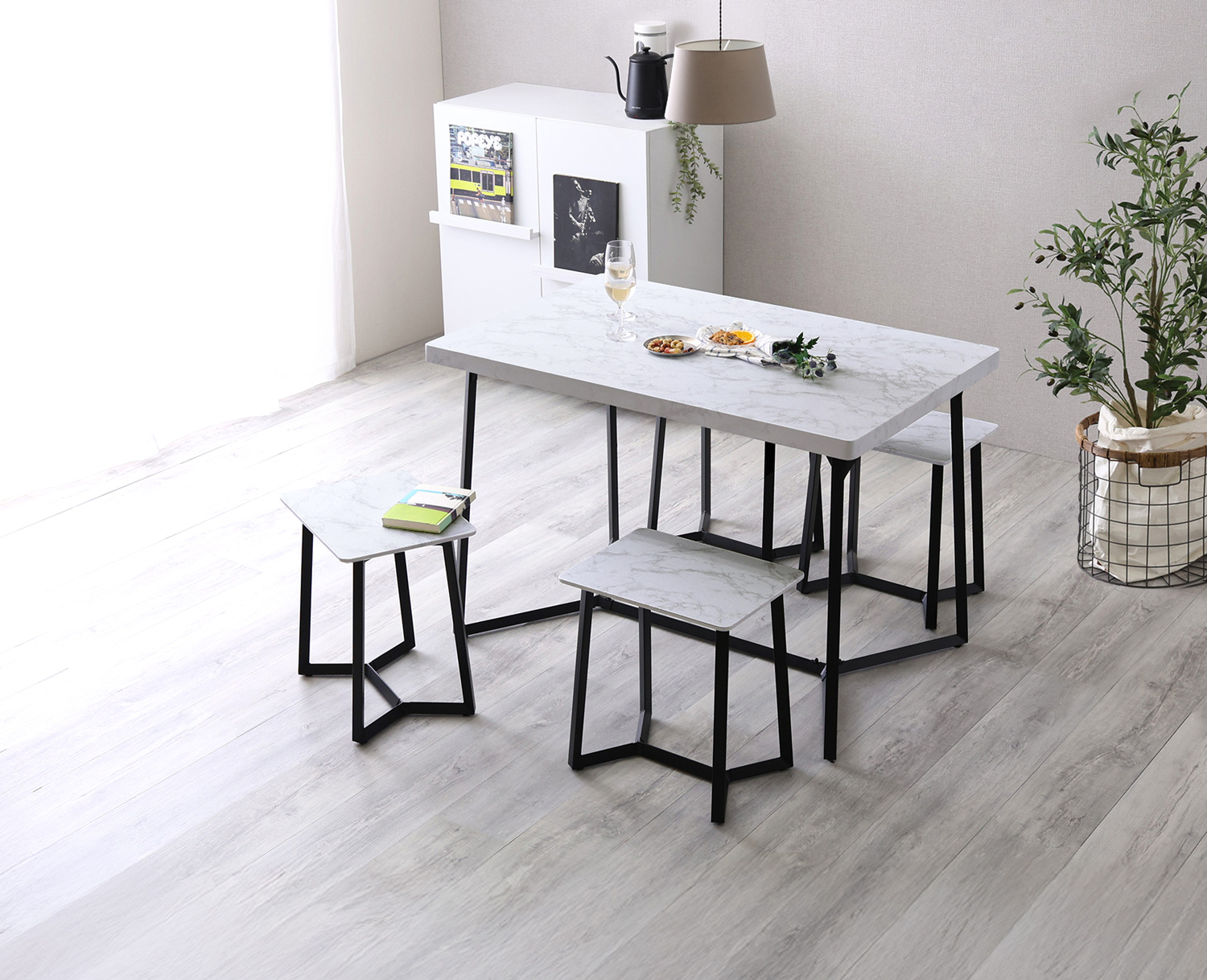 美しい大理石の模様を施したダイニングテーブルと、スツールタイプのチェア4脚の大理石調ダイニング5点セットです。直線的なデザイン、シャープなフォルムで洗練された印象のダイニング。リアルな大理石柄の天板のダイニングテーブルは、2人~4人で使うのに丁度良い、広すぎず、狭すぎない食事にぴったりのサイズ。チェアはスツールタイプを採用しており、前後左右から腰掛けやすく、軽量で出し入れもスムーズ。耐荷重約100kgで安定感があります。ホワイト、グレーの2色から選べます。