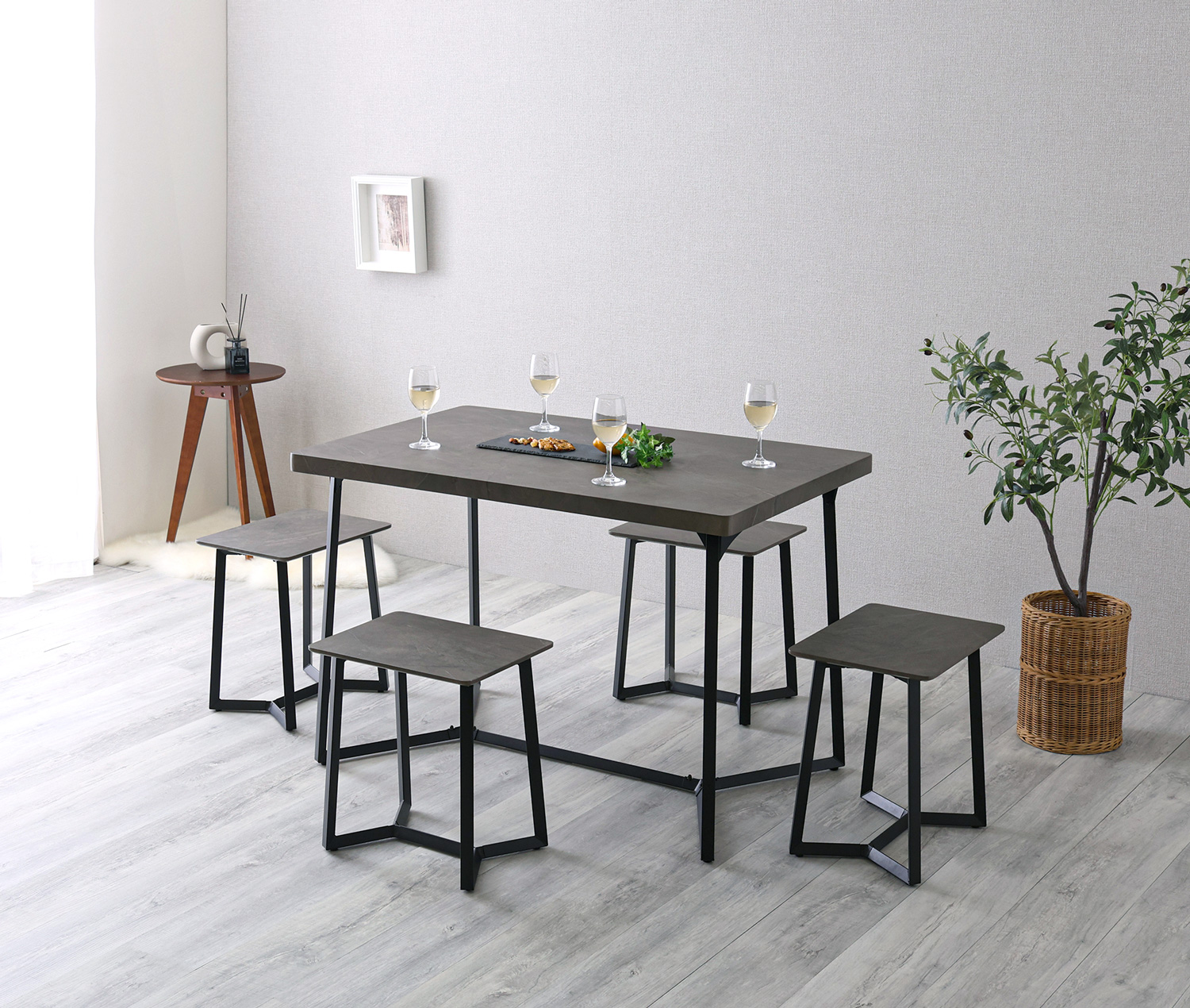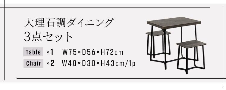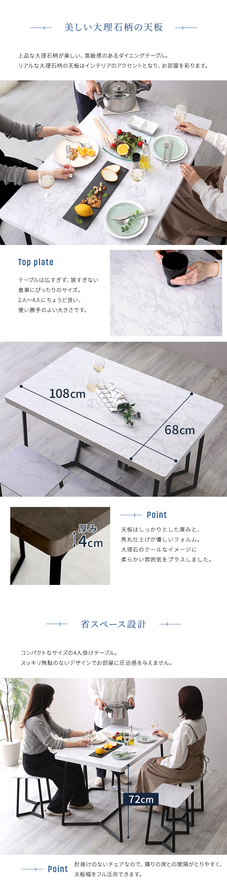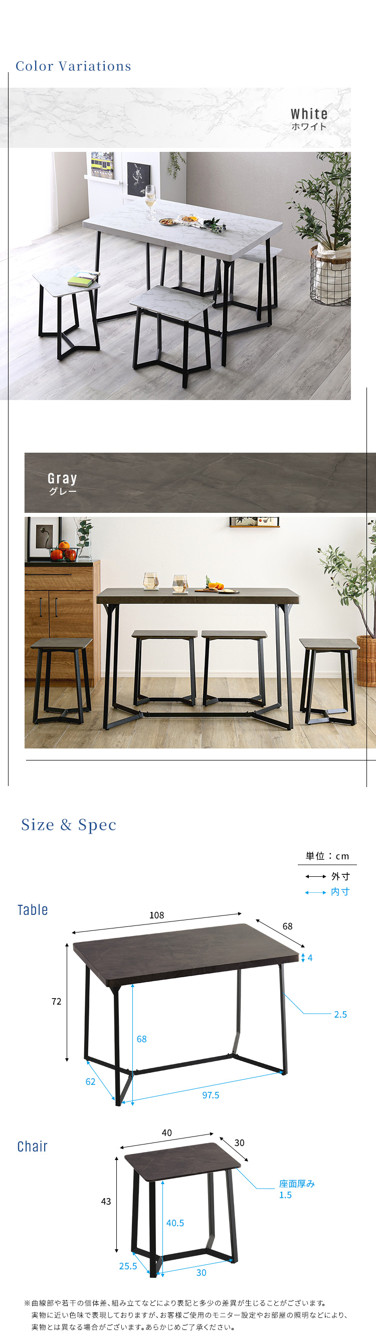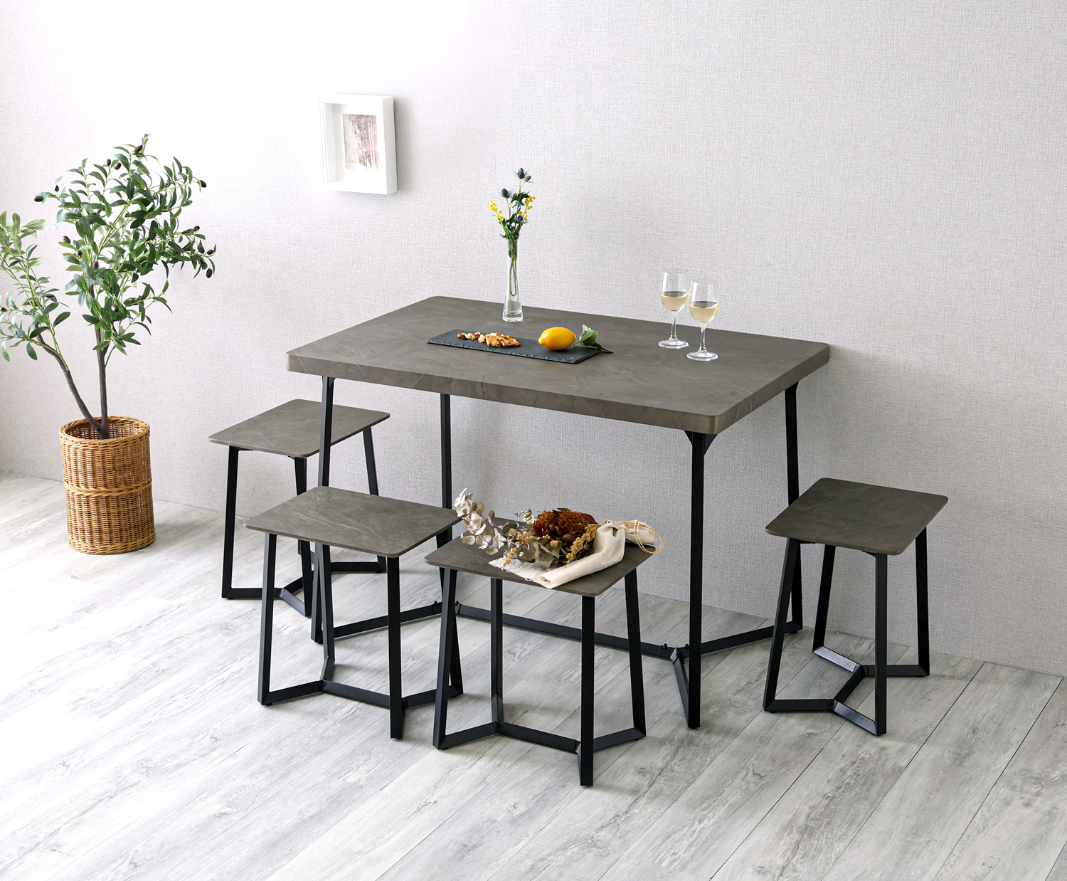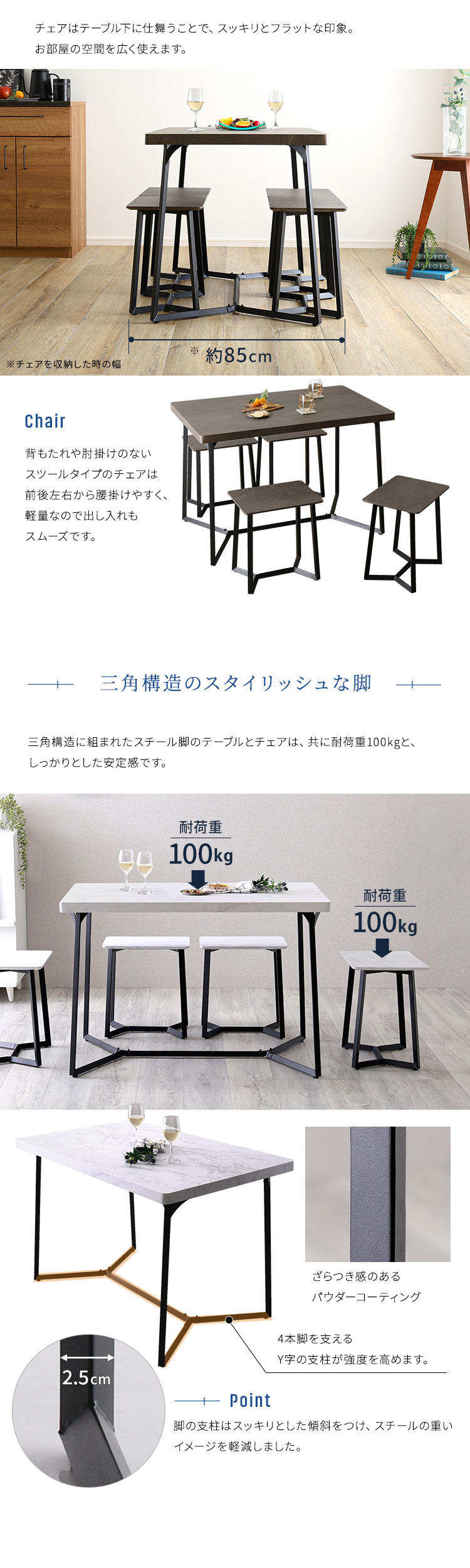 美しい大理石の模様を施したダイニングテーブルと、スツールタイプのチェア4脚の大理石調ダイニング5点セットです。直線的なデザイン、シャープなフォルムで洗練された印象のダイニング。リアルな大理石柄の天板のダイニングテーブルは、2人~4人で使うのに丁度良い、広すぎず、狭すぎない食事にぴったりのサイズ。チェアはスツールタイプを採用しており、前後左右から腰掛けやすく、軽量で出し入れもスムーズ。耐荷重約100kgで安定感があります。ホワイト、グレーの2色から選べます。