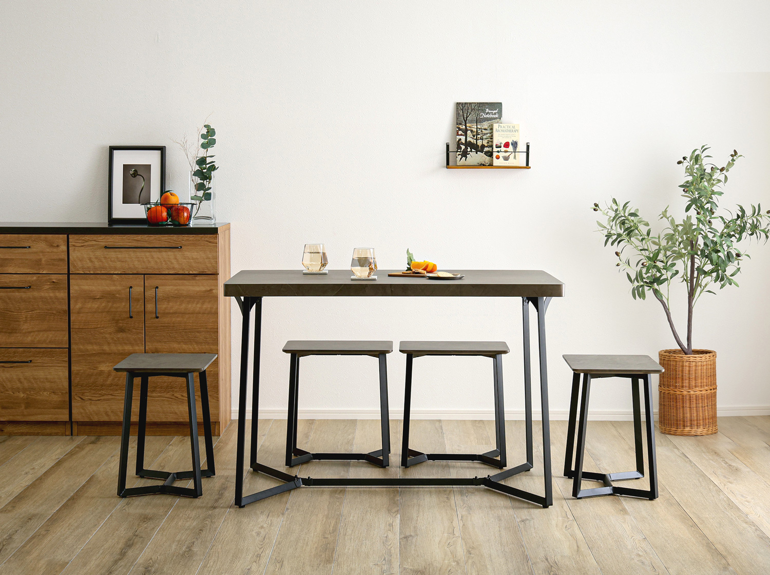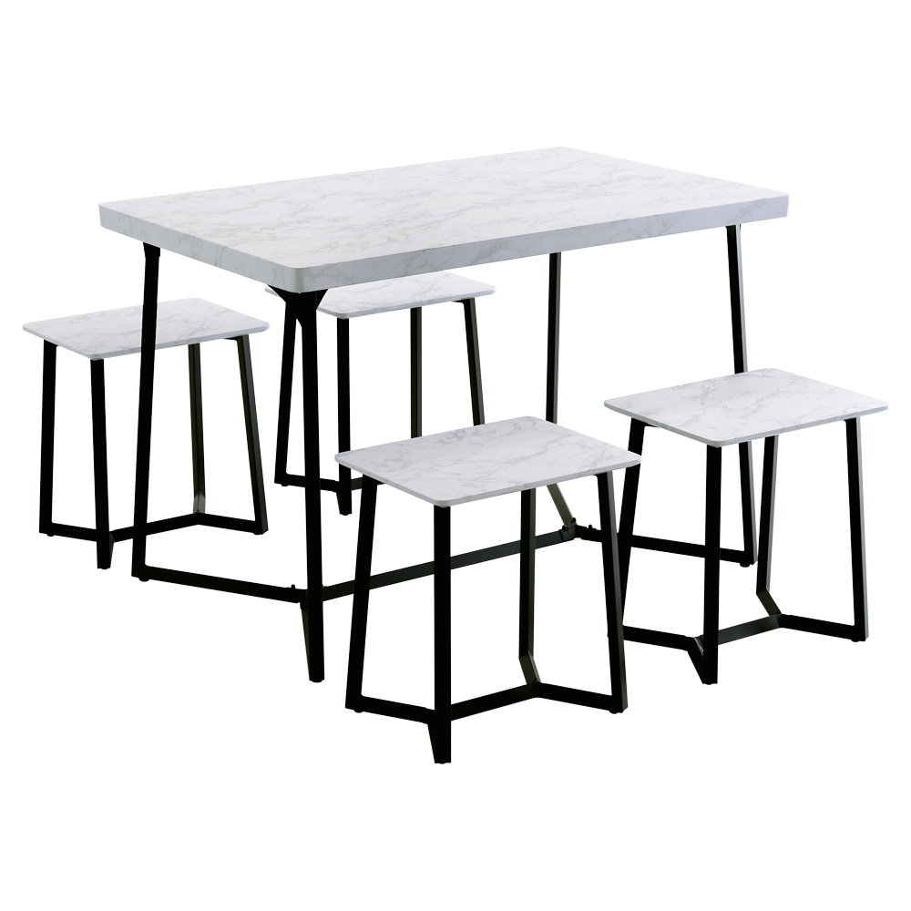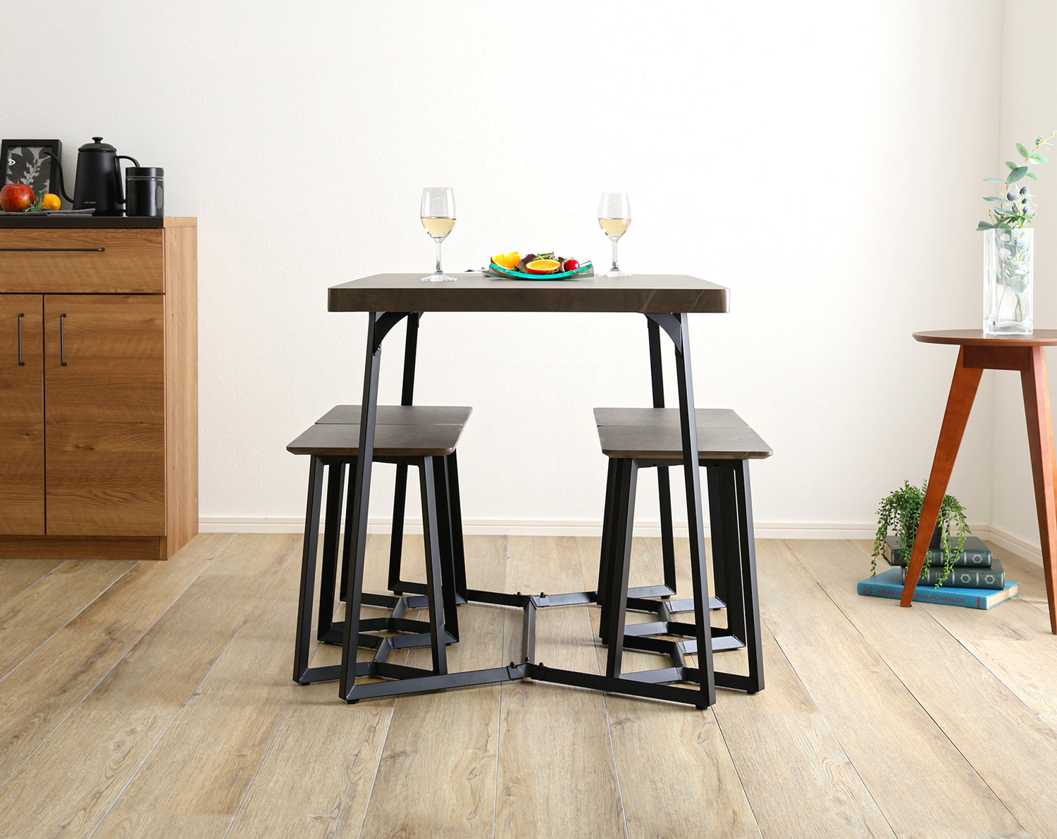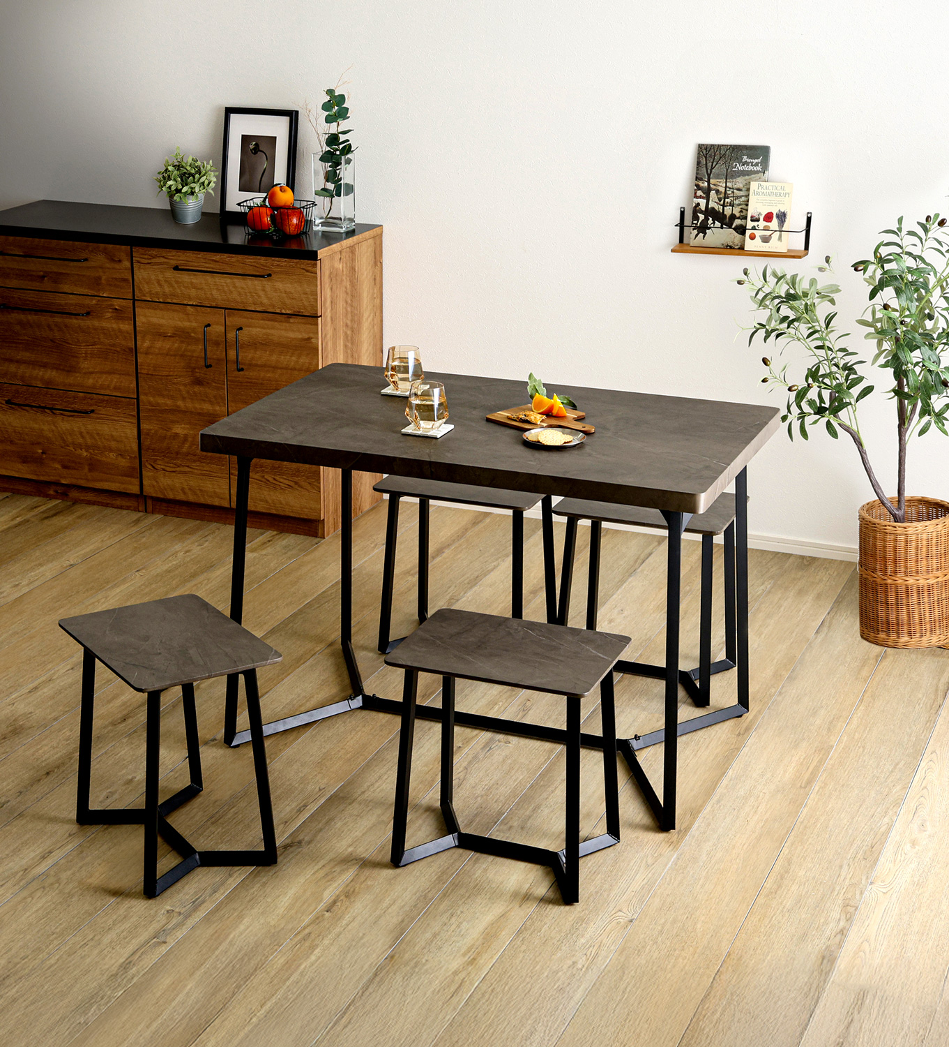 美しい大理石の模様を施したダイニングテーブルと、スツールタイプのチェア4脚の大理石調ダイニング5点セットです。直線的なデザイン、シャープなフォルムで洗練された印象のダイニング。リアルな大理石柄の天板のダイニングテーブルは、2人~4人で使うのに丁度良い、広すぎず、狭すぎない食事にぴったりのサイズ。チェアはスツールタイプを採用しており、前後左右から腰掛けやすく、軽量で出し入れもスムーズ。耐荷重約100kgで安定感があります。ホワイト、グレーの2色から選べます。