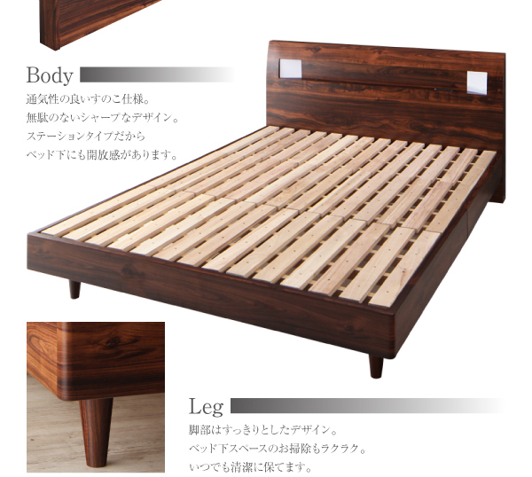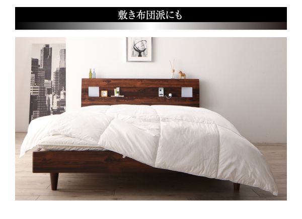 両側にライトを備え、宮棚、コンセントも完備した、機能性の高いヘッドボードです。デザイン性も高く、スタイリッシュな仕上がりです。脚元はスッキリした印象を与えるレッグ仕様で、床板にはすのこを採用しています。通気性が高く、布団でも使える快適な床板です。
